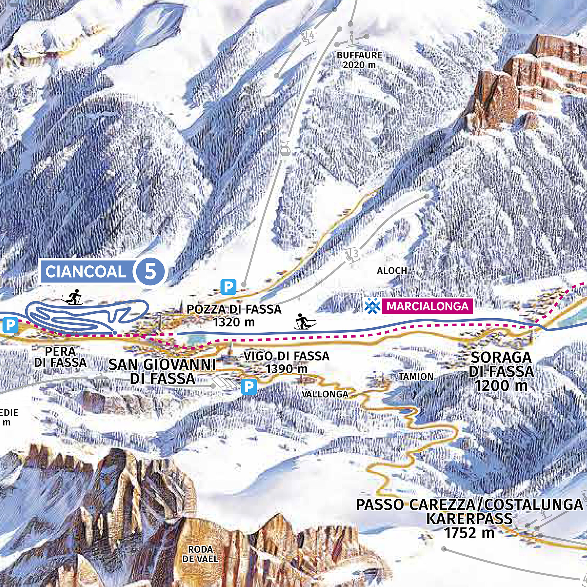The slopes in the "Ciancoal" area, between Pozza and Pera, are organised in loops and divided by difficulty level. The easy course, with its zero gradients, is perfect for those who are just starting out on narrow skis and still need to get to grips with balance and coordination. The medium circuit, suitable for everyone, winds its way through a wide and sunny area that leads to the upper part of "Meida" before returning into the village centre and continuing towards San Giovanni and Soraga. The most difficult and demanding loop extends towards Mazzin. From Pera you enter the Marcialonga track, the venue for Italy's best-known cross-country skiing competition.