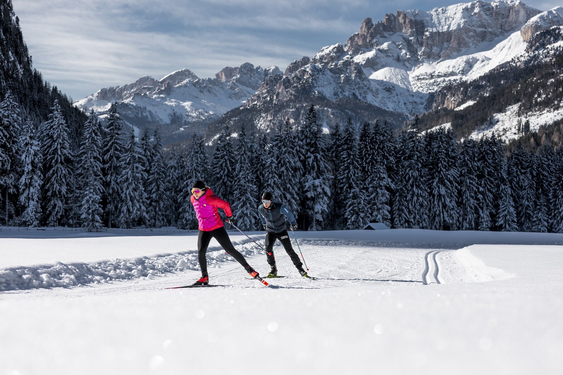 Confidence and balance acquired, you can move on to the open tracks, either alone or with a guide. All the tracks in the village are easy, with small humps and deceptive flat stretches so you can practise without great fatigue or difficulty. While skiing on these tracks, it's easy to get distracted by the magnificent panorama offered by the snow-covered landscapes of Sella, Pordoi and Gran Vernel, which surround and embrace Canazei and the entire Fassa Valley. The course heads up towards the Alba ("Ciasates" loop) or, following the line of the Avisio river, towards "Soreghes - Sot Ronch", through the wide plain that connects Canazei to Campitello. The silence of the forest is only interrupted by the rustle of skis sliding smoothly underfoot.